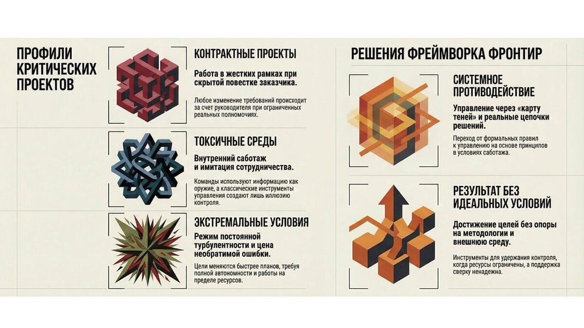 Фреймворк Фронтир создан для того, чтобы в этих условиях не просто выживать, а доводить до результата автономно — без опоры на методологию, без идеальной команды, без благоприятной среды.